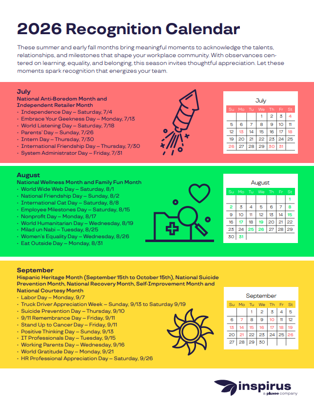Recognition can encompass more than what someone contributes to their job or the organization they work for. Monthly celebrations, holidays, appreciation weeks and special days are great ways to show that you care for your employees, not just for what they accomplish in their career, but for who they are. Download our 2026 Recognition Calendar for ideas.